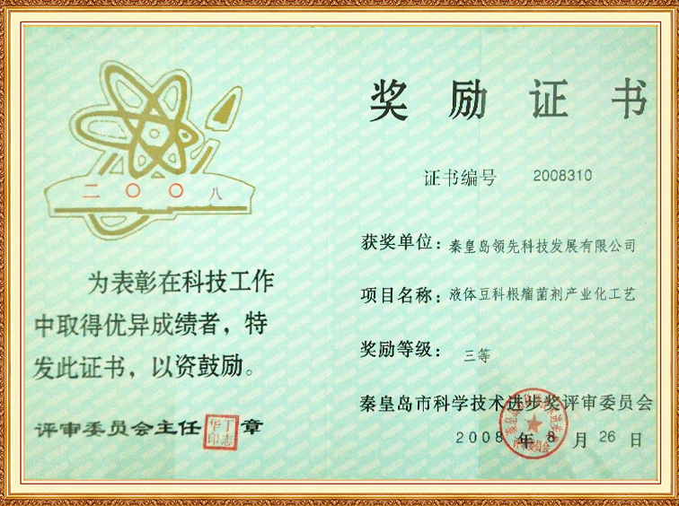 液體豆科根瘤菌劑產(chǎn)業(yè)化工藝—秦皇島市科學(xué)技術(shù)進(jìn)步三等獎(jiǎng)